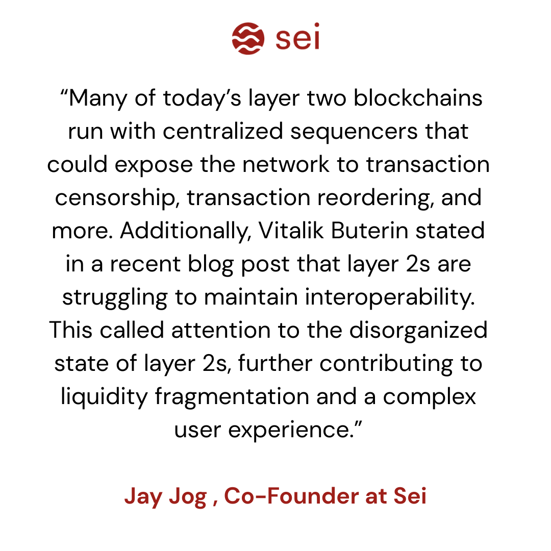Layer 2 solutions act as a sub-optimal quick fix for scalability and gas fee issues. In a blog post on Cointelegraph, Sei’s co-founder Jay Jog shared his opinion: