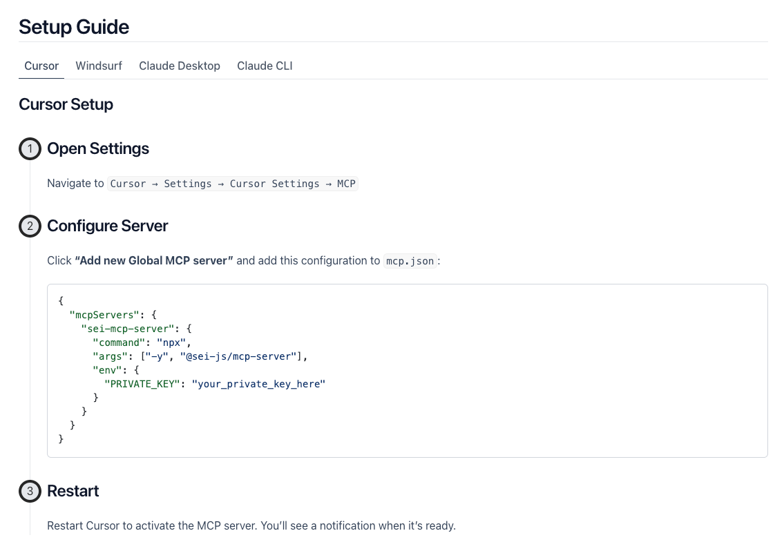 If you’re ready to get started, you can set up Sei’s MCP kit in a few easy steps. Ensure you have a standard installation of Cursor, Windsurf, or Claude, and then you can deploy it from the respective environment's settings. Go to the Sei MCP kit docs and start deploying MCP across each environment today.