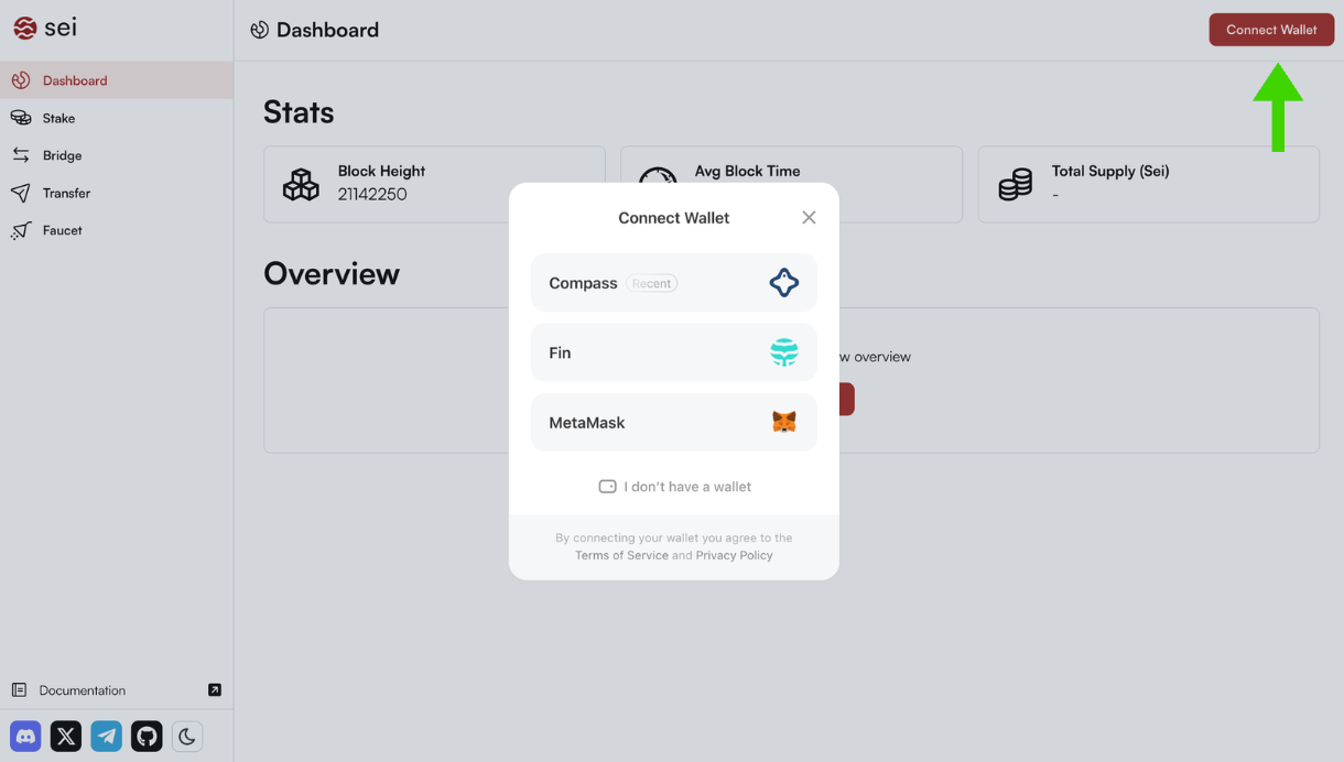 After connecting your wallet to the Sei App, users should navigate to the "dashboard" tab to begin the wallet linking process.
