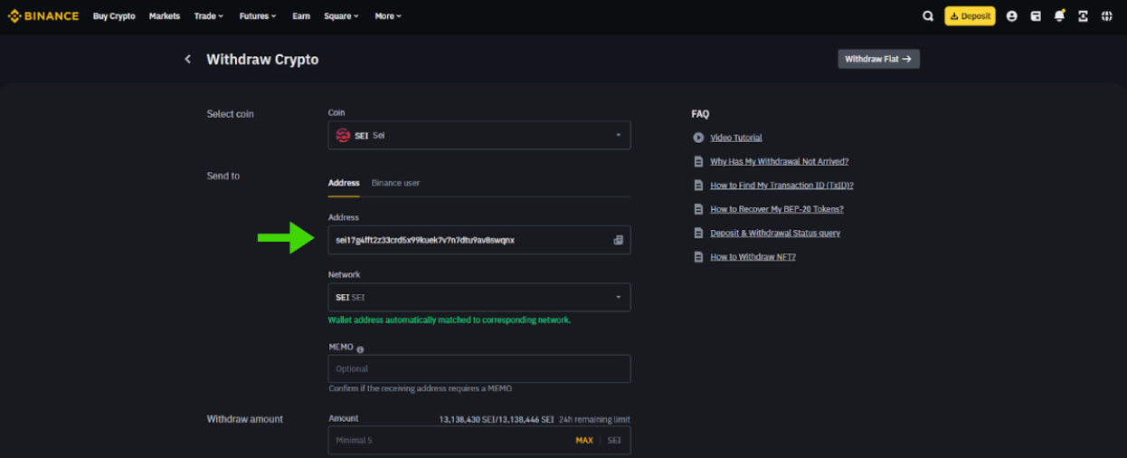 Users can simply copy their address starting with “sei…” and paste into the withdrawal page on their chosen CEX.