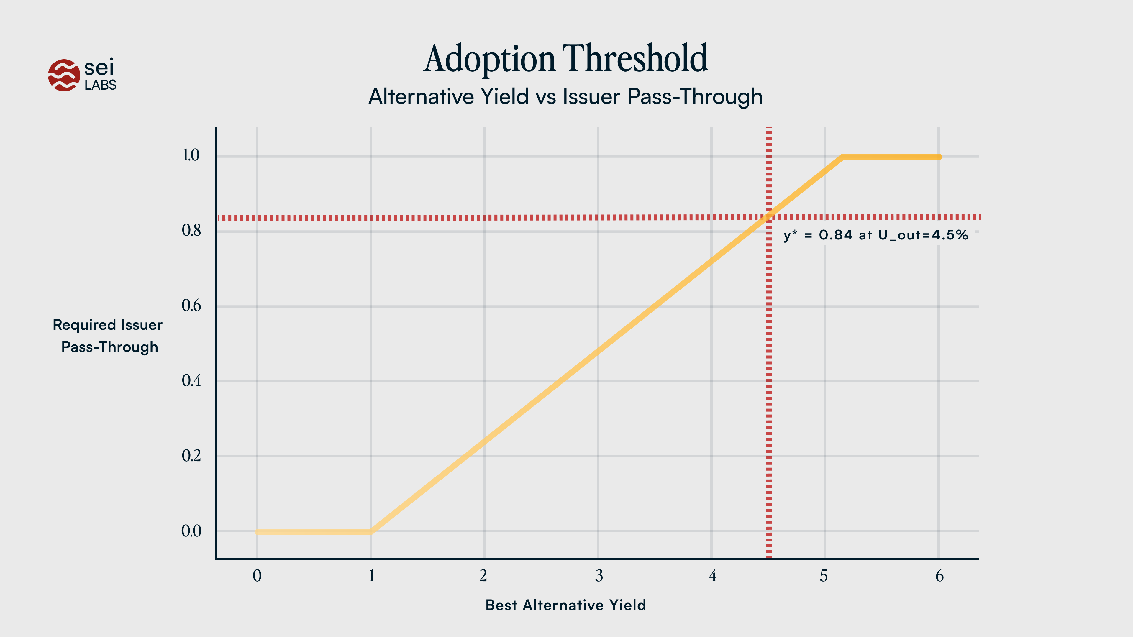 A single picture that explains the policy. Let \(U_0=1 \% \) as a disciplined estimate of a chain's "use value." Then the minimum pass through to clear adoption is \(y^*=(U_{\text{out}}-U_0)/r\) (clipped to \([0,1]\)). When on-chain outside options are \(U_{\text{out}}\approx 4.5 \% \), \(y^*\approx 0.84\). That is why, in practice, most of the carry must be returned to users. (Outside options include on-chain money market exposure (e.g., USDXX) and tokenised T-bill products; see sources in the previous footnote.)