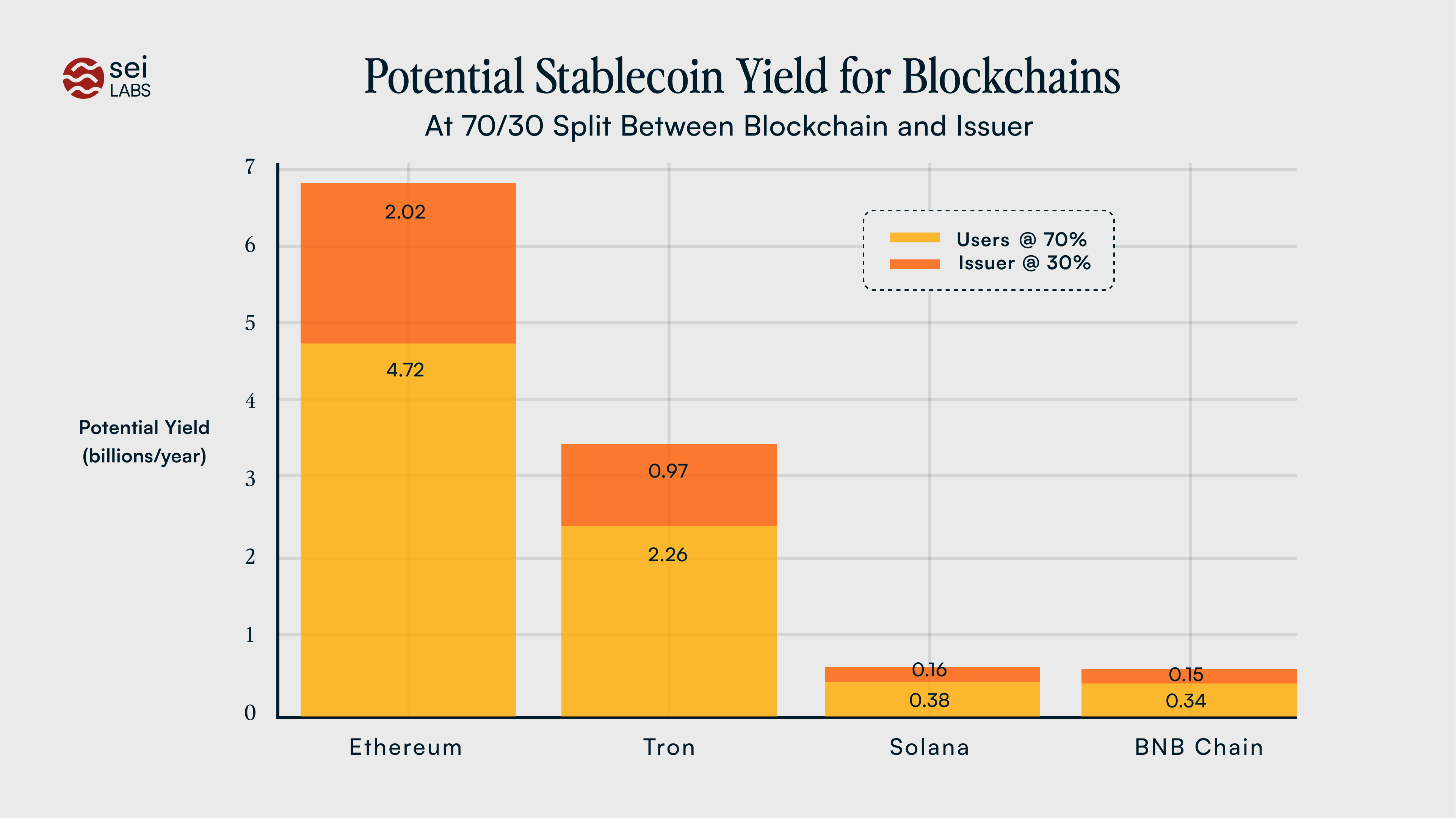Who gets what at 70%. If an issuer targets a simple \(y=70 \%\) pass through, users receive $ 4.72 B /year on Ethereum and $2.26B on Tron; issuers still retain material revenue.
