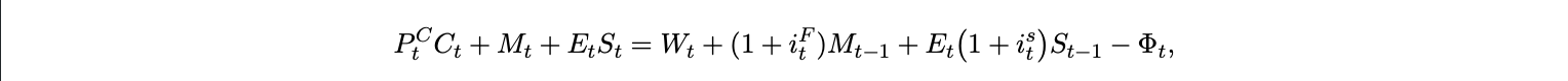 The elasticity parameter ρ governs substitutability between the two monetary assets. A higher ρ means domestic money and stablecoins are close substitutes in liquidity provision. The household faces the budget constraint