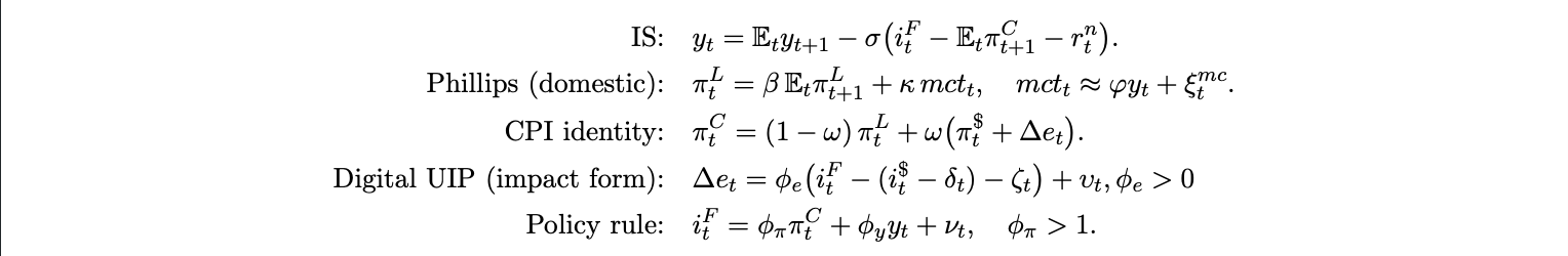 We now embed the preceding components in a minimal small open New Keynesian block. This structure closes the model and produces transparent, closed form expressions for CPI pass-through elasticities that can be used to quantify how stablecoin adoption amplifies U.S. monetary spillovers. The system combines a standard intertemporal IS curve4 , a domestic New Keynesian Phillips curve, a CPI identity linking local and USD priced components, a reduced form “digital UIP” for exchange rate dynamics, and a Taylor style policy rule: