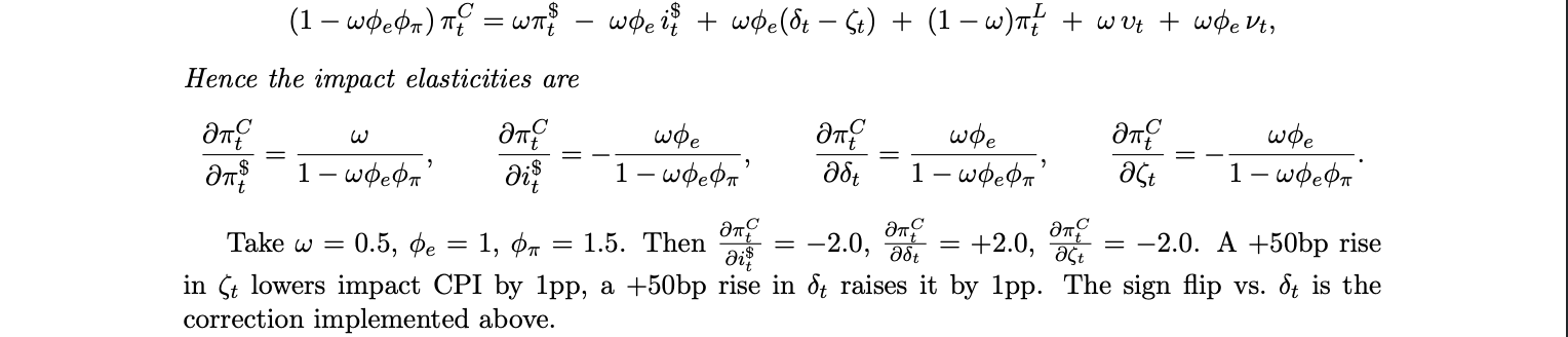 Thus a modest increase in dollar pricing share produces a disproportionate rise in CPI sensitivity to U.S. shocks. The result formalizes the our previous intuition that once a significant fraction of domestic pricing and liquidity is dollar denominated, local inflation reacts almost one for one to U.S. conditions. Stablecoin adoption magnifies this link by raising ω and tightening the digital UIP channel, effectively substituting the Fed’s reaction function for the local one.