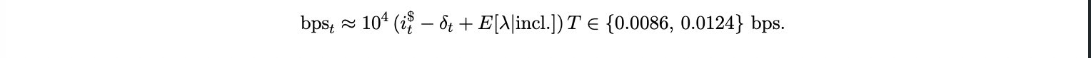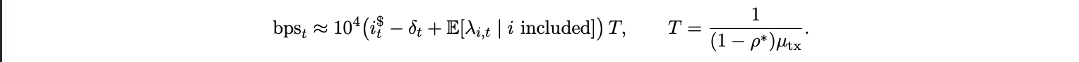 Throughout, i$ and is are annualized rates, T is the expected time to inclusion in years. With these units, bpst is dimensionless and interpretable as basis points of notional. Thus the implicit “interest rate” of transacting is the opportunity cost of time, scaled to basis points of transaction size. A reduced form for the value of time is