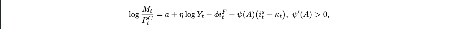 where κt is a per unit stable friction. Real seigniorage is st ≡ (Mt − Mt−1 )/PtC ≈ µt (Mt−1 /Pt−1 with µt money growth. Adoption raises ψ and lowers δt , reducing real money demand for given iFt and eroding seigniorage. Thus, as adoption A rises (so ψ(A) increases and frictions κt fall), a higher stable yield reduces real money demand, eroding the seigniorage base.