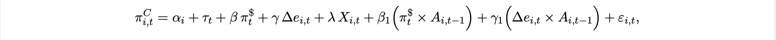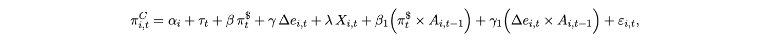 with a country-specific ceiling A⋆ ≤ 1. Currency weakness (∆et > 0), domestic inflation, and higher U.S. yields can all push adoption upward by raising the shadow value of USD settlement and hedging against local currency risk. Substituting the above into the adoption law and time variant CES from 2 produces a tractable dynamic link from global dollar conditions to πtC via ωt . At monthly or quarterly horizons, a minimal reduced form that captures the cross-regime prediction above is