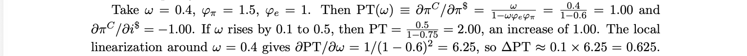 Thus it is shown that stablecoin adoption amplifies foreign monetary transmission through ω and ϕe . The denominator 1 − ωϕe ϕπ captures the feedback loop between imported inflation and local policy response, a higher ϕπ paradoxically increases the degree of pass-through by feeding back into the CPI via the exchange rate. With ϕe = 1 and wedges fixed, define P T (ω) ≡ ∂πtC /∂πt$ = ω/(1 − ωϕπ ). Then