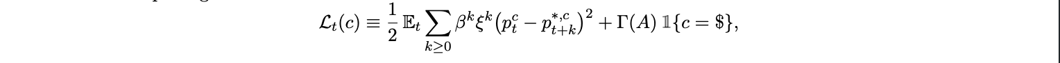 where pt+k is the desired (log) price in currency c, β ∈ (0, 1) is the discount factor, and Γ(A) captures the net cost of quoting in dollars, decreasing in adoption A (so Γ′ (A) < 0). The term Γ(A) summarizes settlement frictions, regulatory costs, and acceptance premia that vanish as stablecoins become ubiquitous. Under standard approximations, desired prices track expected marginal costs and output: