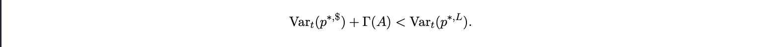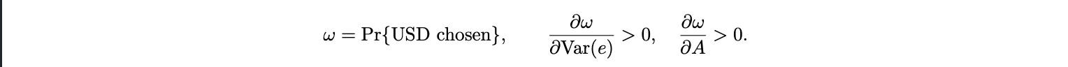 The above equation defines the firm’s invoicing choice. Dollar invoicing becomes more attractive when either (i) exchange rate volatility Var(e) rises, or (ii) adoption A reduces the cost of dollar settlement Γ(A). Aggregating across firms gives the equilibrium USD pricing share: